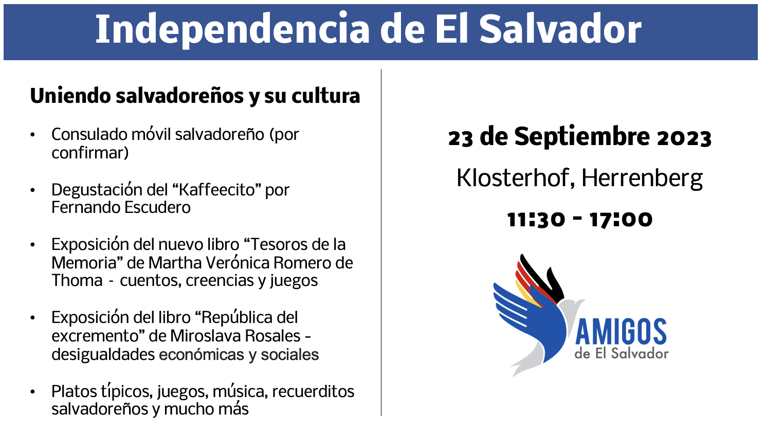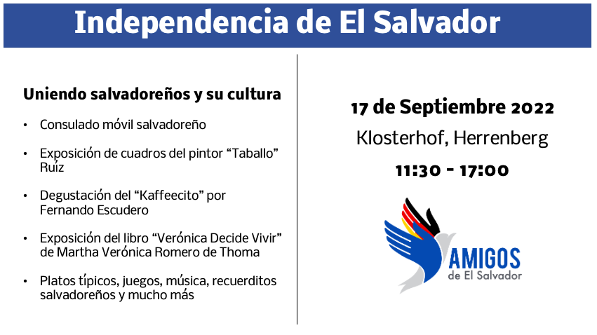 Wir werden köstliche typische Gerichte, Programme für Kinder, Spiele, Musik und Ausstellungen talentierter Salvadorianer haben....